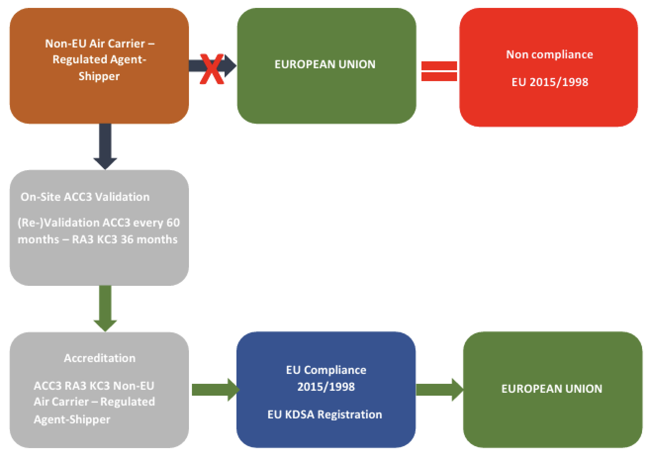 EU Legislation concerning ACC3 RA3 KC3 Air carriers flying cargo and mail into the EU from non-EU countries are required to comply with EU regulations for the security standards concerning the loading of an aircraft bound for all EU countries. The designation “Air Cargo or Mail Carrier is given to the entities operating into the Union from a Third Country Airport (ACC3). To gain ACC3, an airline must acquire EU Aviation Security Validation which are performed by an Independent Validator that has been accredited by the EU and Member State in which the ACC3 application has been made. A successful validation is maximum valid for 5 years or 60 months. The same validation process applies for Ground Handling Operators (RA3) or shippers - Known Consignor (KC3). A successful validation RA3 KC3) is maximum valid for 3 years or 36 months. RA3 KC3 validation process: In order to receive the RA3 KC3 designation a forwarding agent, ground handling agent Regulated Agent or shipper (Known Consignor) must contact an EU Aviation Security Validator to conduct an on-site validation. All approved EU validators are registered in the EU. After agreement with the Validator the necessary documentation is shared to prepare for a successful validation. After the preparations the on-site validation will take place based on the checklist in EU regulation 2015/1998. If the on-site validation is successful, then the Validator will write a validation report and subject to the approval (or rejection) by the EU/Member state authority will grant the RA3 KC3 designation for 3 years or 36 months. The validation report of the forwarding agent can be submitted to the ground handling agent (RA3) and the validation report of the ground handling agent can be submitted to the air carrier (ACC3) in order to be a part of the EU validated supply chain. A shipper (Known Consignor) or a Regulated Agent does not need to be approved by the local CAA on ICAO standards for receiving RA3 or KC3 designation. The RA3 and KC3 designation can only be used for secure transport of cargo post or mail to or through the EU.